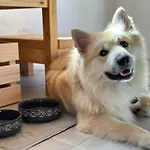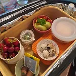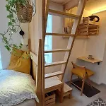 The kitchen amenities feature an electric kettle, a fridge, and glassware, provided in an outdoor dining area.